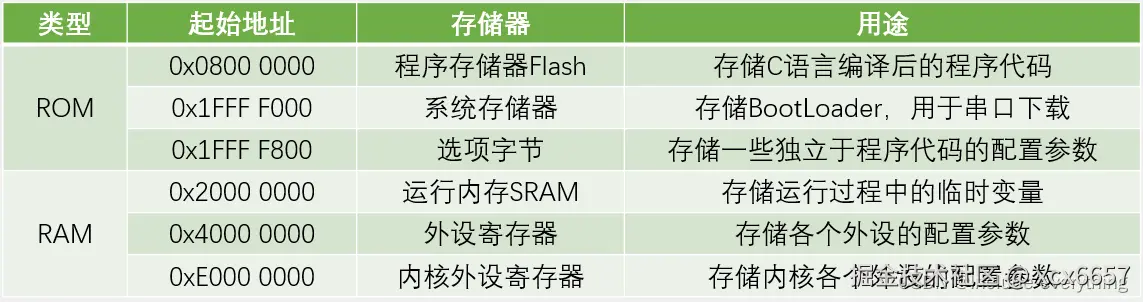- 外设存储器:存储各个外设的配置参数。初始化外设相当于对其中的数据进行读写。外设存储器也是存储器的一种,它的存储介质同样是SRAM。