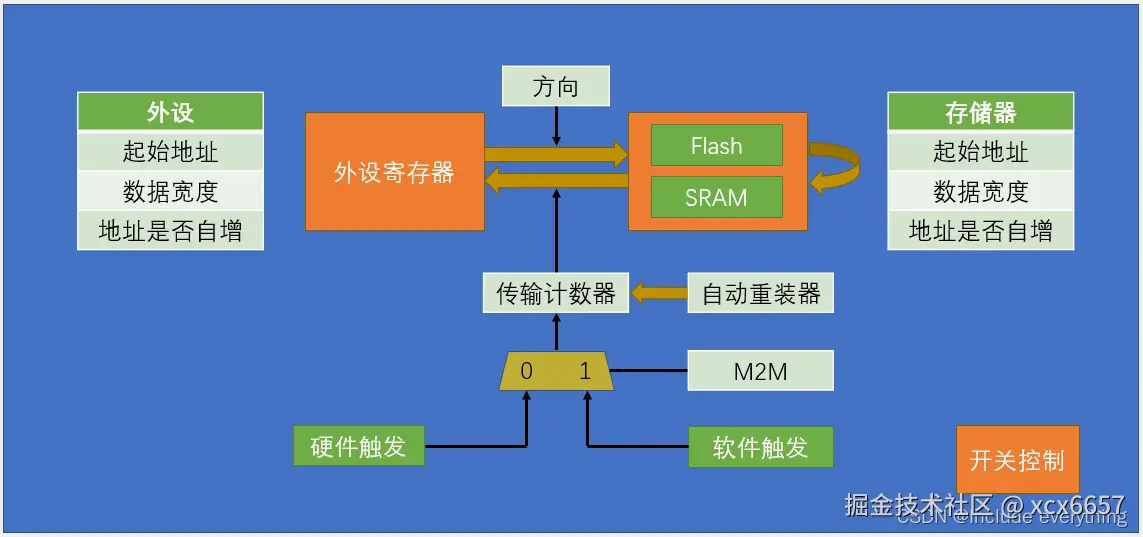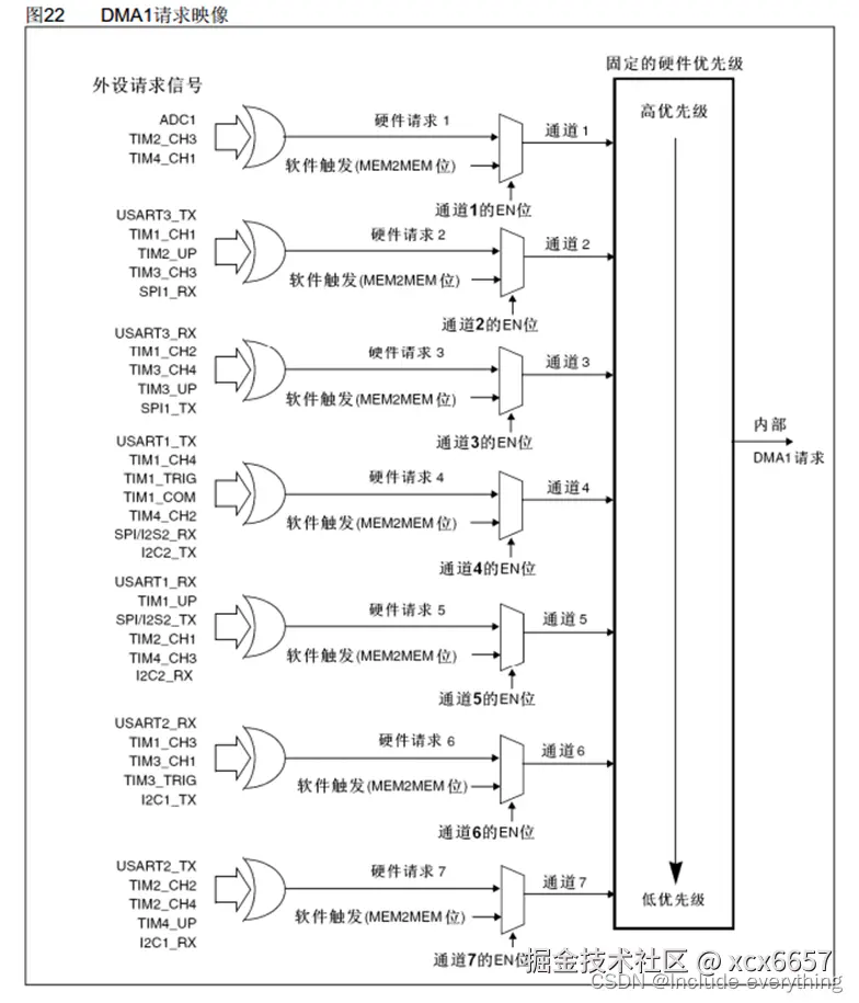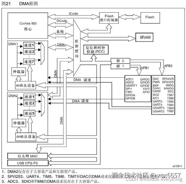首先,上图展现了STM32的Cortex-M3内核,可以将除该内核以外的其他部分都看作存储器。 DMA的主要结构分为: