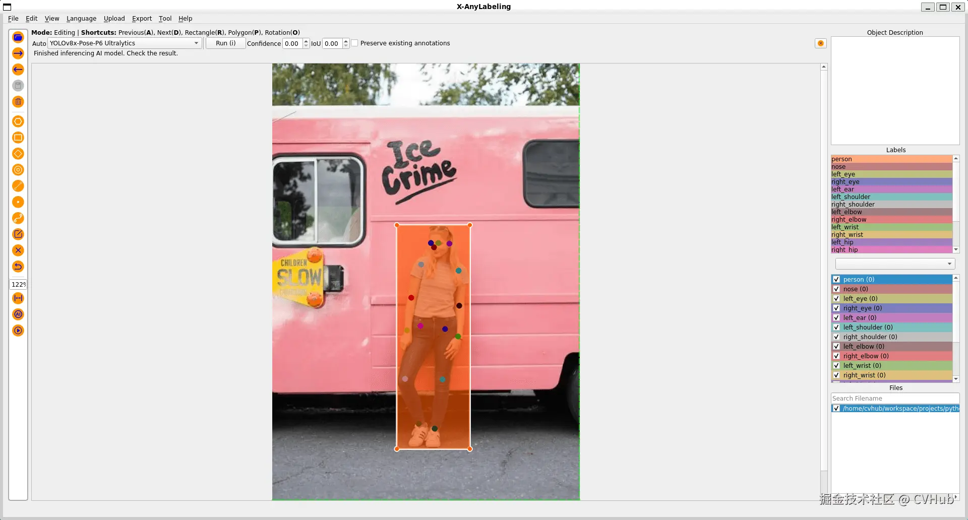 此外,对于全身人体姿态估计任务,X-AnyLabeling 中内置了包括 yolov8-pose、yolox-dwpose 以及 rtmo-dwpose 在内的三款主流姿态估计模型供用户选择。