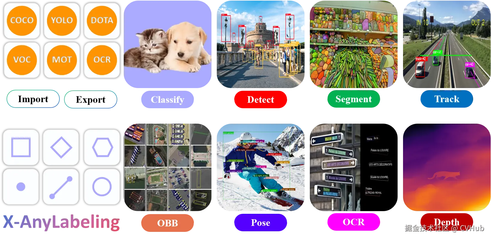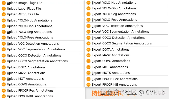 为了进一步提升数据处理效率,确保大家能够轻松快捷地将数据进行导入与导出,X-AnyLabeling 精心设计并集成了对当前市场上各大主流训练框架,如YOLO、OpenMMLab、PaddlePaddle等,所广泛使用的数据集格式的全面支持。这一功能大大简化了数据准备工作流程,让用户能够更加专注于模型训练和优化。