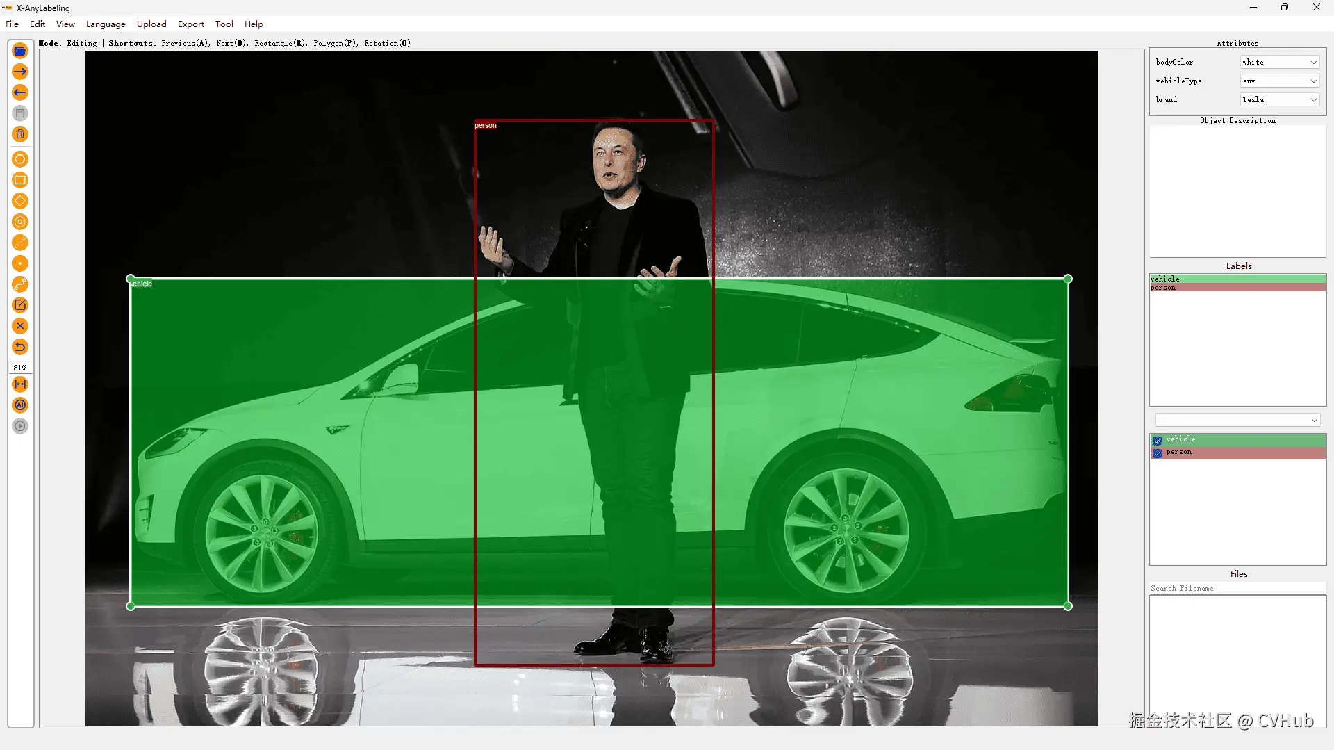 当前,X-AnyLabeling 中适配了 paddlepaddle 开源的 PULC 车辆属性(Vehicle Attribute)和行人属性(Person Attribute)模型。整体的用户界面(UI)设计也参照 CVAT 的标注范式,为用户提供更加一致和友好的体验。详情可参考以下教程: