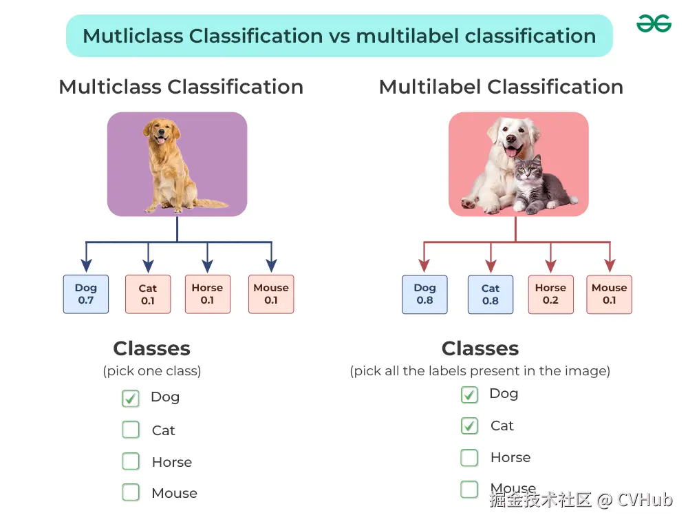 - 多标签分类(Multilabel classification):与多类别分类不同,多标签分类允许一张图像同时属于多个类别。在这种情况下,图像中的内容可能涉及多个标签,而这些标签之间并不互斥。例如,一张图片可能同时包含一只猫和一只狗,因此该图片将被同时标记为“猫”和“狗”。多标签分类模型需要识别图像中的所有相关元素,并为每个元素分配相应的标签。