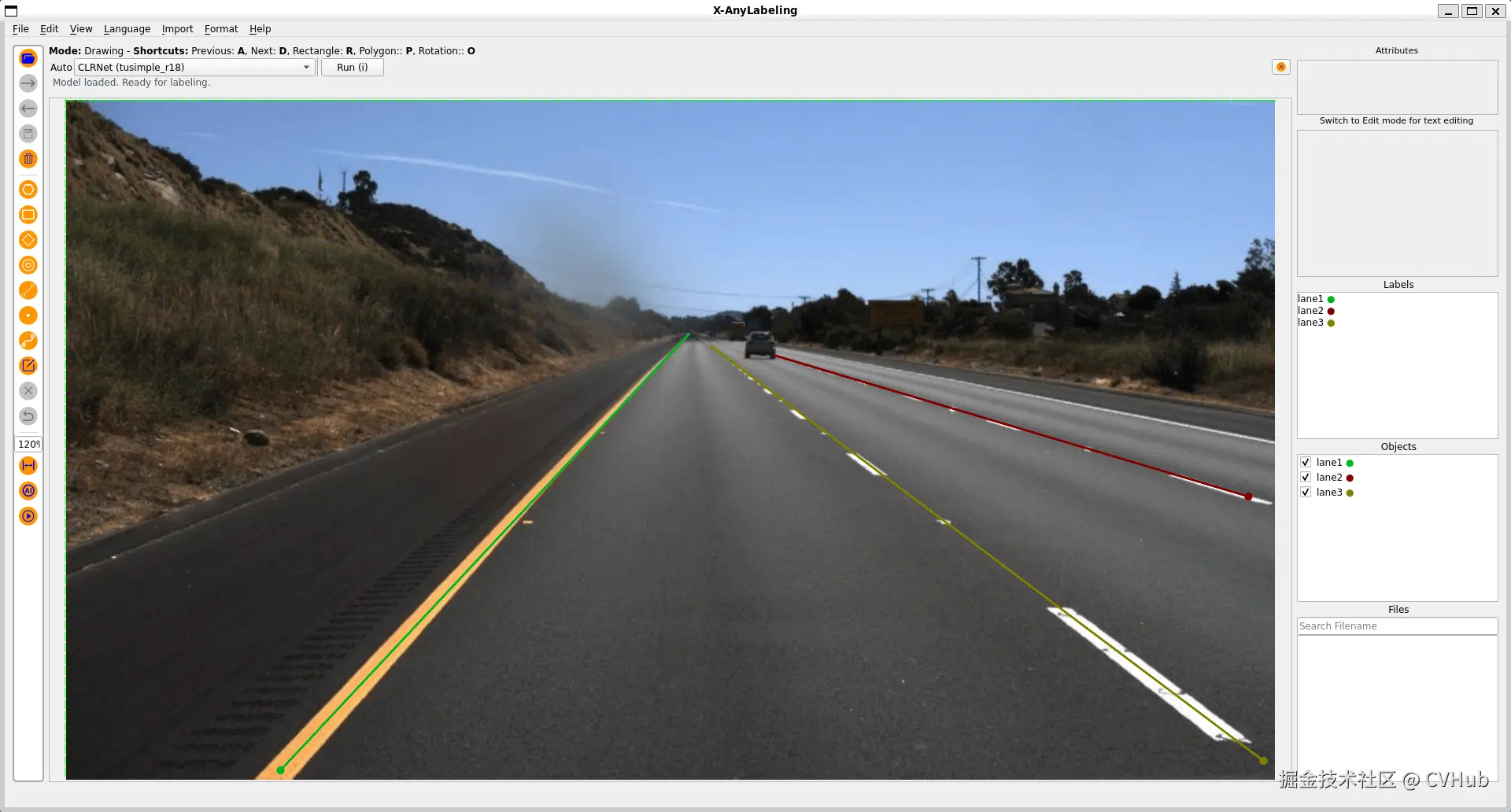基于Line模式,X-AnyLabeling 中集成了 CLRNet-Tusimple (CVPR 2022) 模型供大家快速体验: