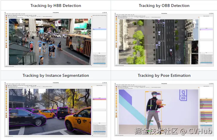 多目标跟踪(MOT)技术用于在视频序列中同时识别和跟踪多个目标,涉及在不同帧之间关联目标。在X-AnyLabeling 中,我们提供了基于 ByteTrack 和 BotSort 的目标跟踪器,同时支持以下四大任务的跟踪。