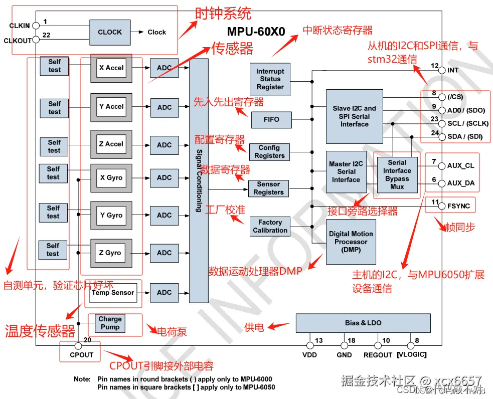 - 在仅有6轴的情况下无法保证一定是平衡的,欧拉角不够稳定,所以需要接入磁力计或者气压计来增加准确度,而XCL、XDA这两个引脚就是用来外接磁力计或者气压计使用的,在接入磁力计或者气压计后MPU6050的主机接口可以直接访问这些扩展芯片的数据,将数据读取进MPU6050中,在芯片中有DMP单元进行数据融合和姿态解算,但是如果不需要姿态解算功能的话其实也可以直接接在SCL和SDA这条总线上。