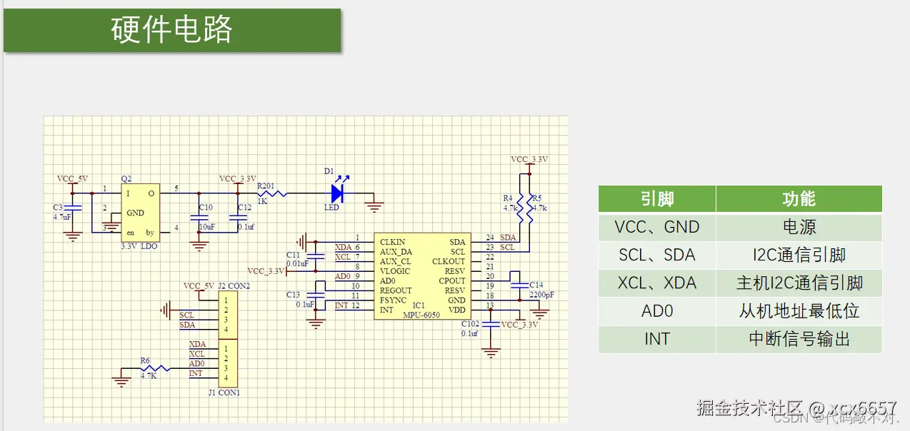 - 左上角LDO是供电的逻辑,MPU6050的供电脚是2.375-3.46v,左上角是为了产生稳定的3.3v,因此有了稳定的3.3v,左上角就可以不要