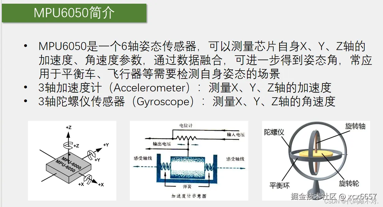 - MPU6050是一个6轴姿态传感器,可以测量芯片自身X、Y、Z轴的加速度、角速度参数,通过数据融合,可进一步得到姿态角也叫做欧拉角,常应用于平衡车、飞行器等需要检测自身姿态的场景