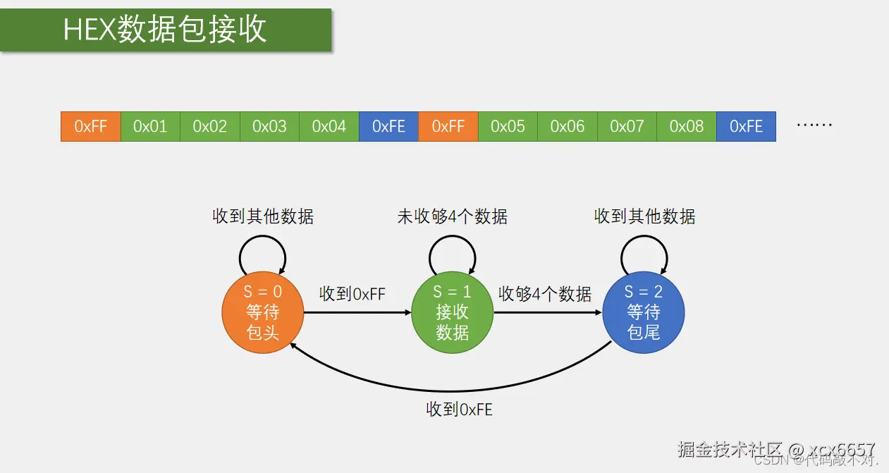 我们先看一下如何来接收这个固定包长的HEX数据包。要接收固定包长的HEX数据包,我们需要设计一个状态机来处理。根据之前的代码,我们知道每当收到一个字节,程序会进入中断。在中断函数里,我们可以获取这个字节,但获取后需要退出中断。因此,每个收到的数据都是独立的过程,而数据包则具有前后关联性,包括包头、数据和包尾。为了处理这三种状态,我们需要设计一个能够记住不同状态的机制,并在不同状态下执行不同的操作,同时进行状态合理转移。这种程序设计思维就是“状态机”。