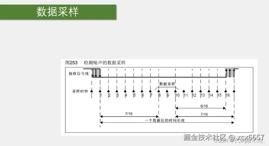 根据手册描述,接收电路在下降沿之后的第3次、5次、7次进行一批采样,在第8次、9次、10次再进行一批采样。这两批采样都要求每3位里面至少应有2个0。如果没有噪声,那肯定全是0,满足情况;如果有一些轻微的噪声导致3位里面只有两个0,另一个是1,那也算是检测到了起始位(但是在状态寄存器里会置一个NE(Noise Error),提醒你数据收到了但是有噪声,你悠着点用);如果3位里面只有1个0,那就不算检测到了起始位,可能前面那个下降沿是噪声导致的,这时电路就忽略前面的数据重新开始捕捉下降沿。