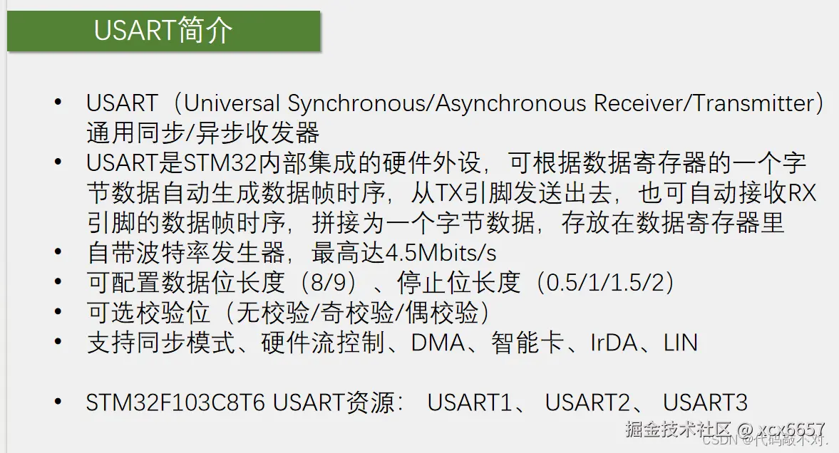 - USART(通用同步/异步收发器):我们经常还会遇到串口,叫UART,少了个S,就是通用异步收发器,一般我们串口很少使用这个同步功能,所以USART和UART使用起来,也没有什么区别。