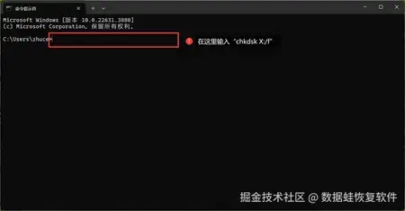 第2步: 打开命令提示符,在里面输入命令“chkdsk X: /f”,输入完毕后点击键盘上的回车键。