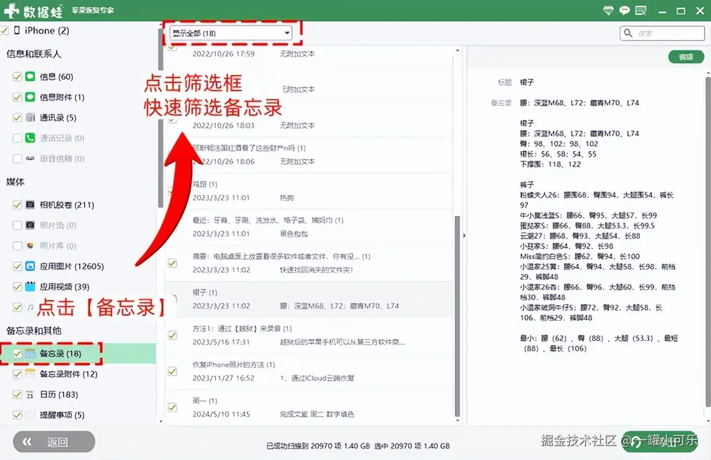 步骤2:完成数据扫描后,点击 【备忘录】 应用选项,可点击界面上方的筛选框,快速定位被删除的备忘录数据。