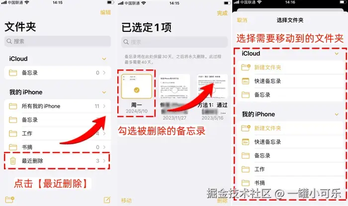 步骤2:在最近删除中找到已删除的备忘录,并勾选,然后将其移动到指定的文件夹中即可。