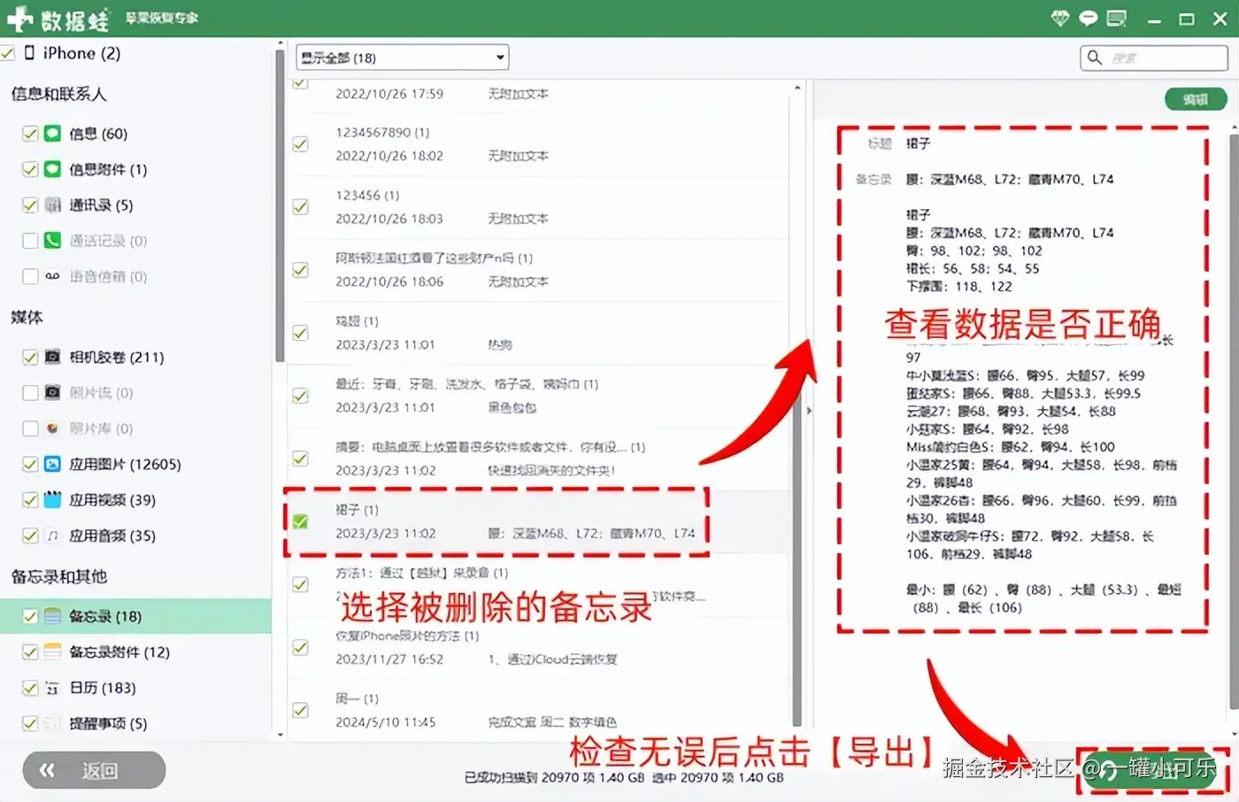 步骤3:找到并勾选被删除的备忘录数据,查看显示的数据是否正确,检查无误后,点击下方的 【导出】 ,然后选择导出数据的存储位置,等待数据导出后即可查看。