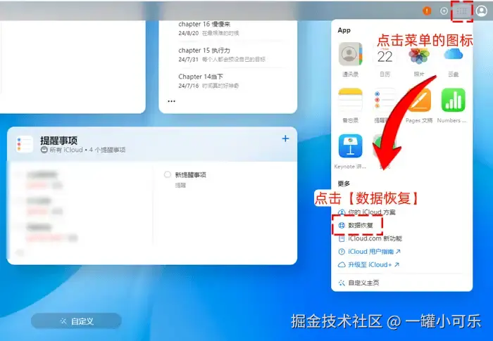 步骤1:登录网页版的iCloud,在主界面中,点击右上角的菜单选项。
