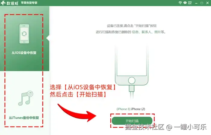 步骤1:打开软件运行,用数据线连接iPhone和电脑后,点击 【从iOS设备中恢复】-【开始扫描】 ,等待软件扫描数据完成。
