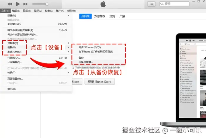步骤2:在iTunes的页面中,选择文件,然后依次点击 【设备】-【从备份恢复】 就可以将删除的备忘录数据恢复到手机上。