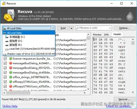 Recuva也是一款免费的电脑数据恢复软件,作为一款全免费的数据恢复工具,使用这款软件,可以恢复被错误删除的各种格式的文件。只要是没有在同一位置上被重复写入数据,不管数据时被格式化了还是被手动误删了,都能够进行数据恢复。