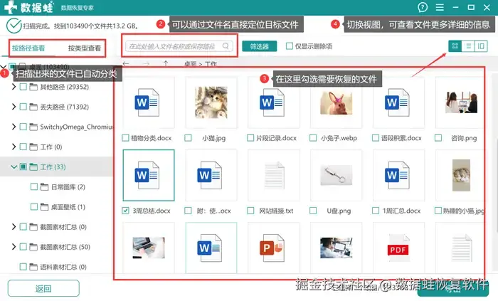 第2步: 扫描文件出现后,可以选择直接恢复快速扫描的结果,也可以再等待一会,选择深度扫描完成后再进行文件恢复。然后可以通过搜索框,根据文件名直接搜索出自己需要恢复的文件,也可以切换文件视图查看扫描文件更多的详细信息。
