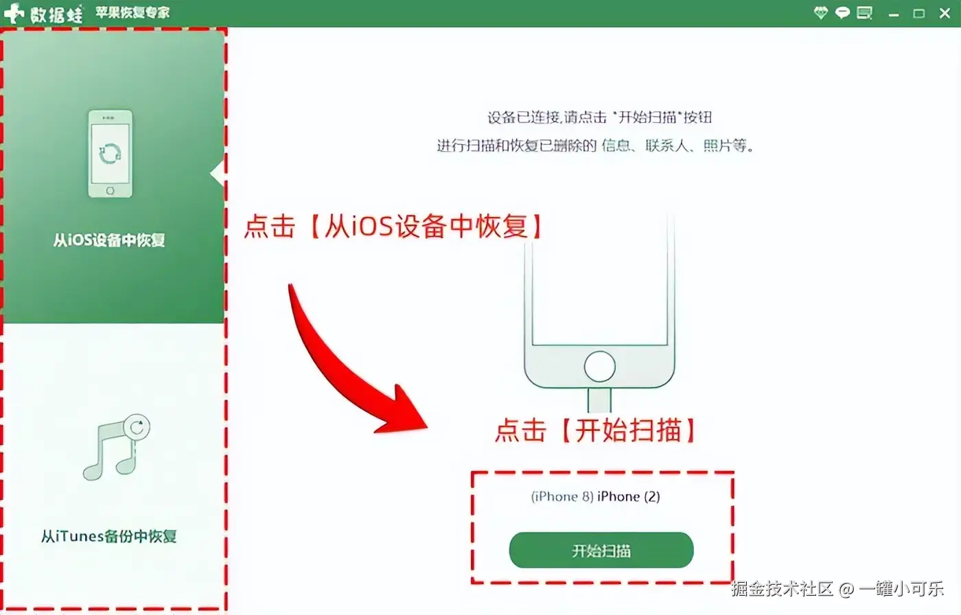 步骤1:安装软件到电脑上,运行软件后点击 【从iOS设备中恢复】 的数据扫描方式,然后点击 【开始扫描】 。
