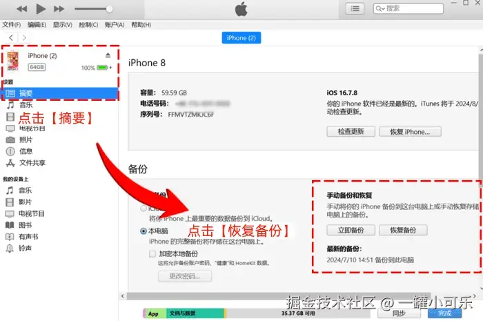 步骤2:在iPhone图标下,点击 【摘要】-【恢复备份】 即可恢复丢失的微信聊天记录。