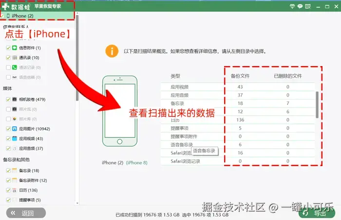 步骤2:扫描完成后,点击iPhone设备选项,即可查看所有的可恢复的数据。