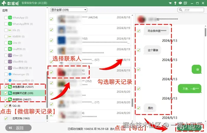 步骤3:在应用栏中点击 【微信聊天记录】 ,选择微信联系人,勾选需要恢复的聊天记录,确认数据无误后,点击 【导出】 即可。