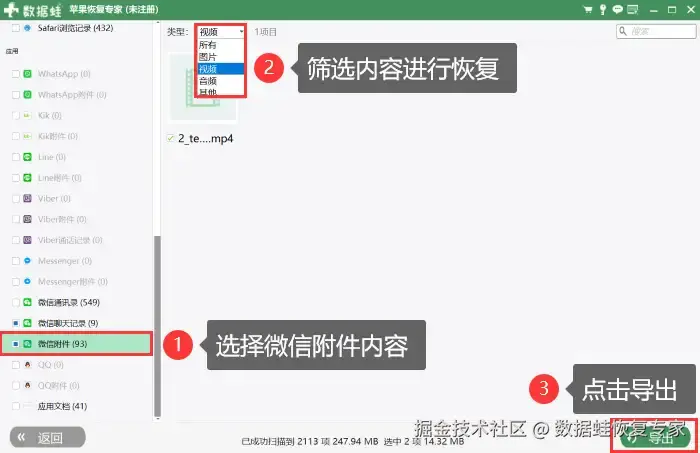 步骤3:扫描完成后,软件将列出所有扫描出来的文件。选择 【微信附件】 ,并筛选 【视频】 进行预览,然后可以选择需要恢复的微信视频文件进行恢复导出即可。