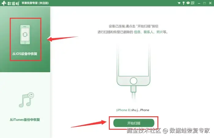 步骤1:下载并安装数据 蛙苹果恢复专家到您的电脑上,连接手机与电脑上,打开软件选择 【从iOS设备中恢复】 进行,点击 【开始扫描】 按钮。