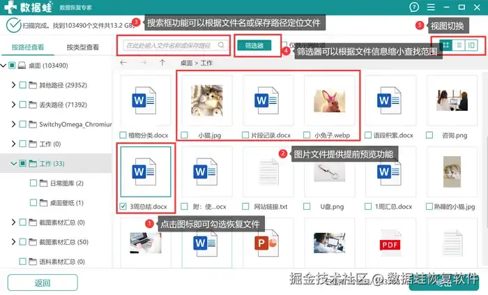 硬盘数据恢复软件哪个好用?360文件恢复操作简单,按照步骤找到【文件恢复】功能后,只需要选择需要扫描的磁盘路径,轻轻一键就能够实现数据恢复。它还能够显示出文件的大小、修改时间、恢复成功率等详细信息,供用户进行文件选择。