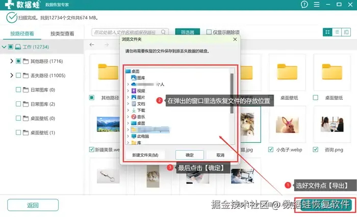 步骤3: 点击【导出】后会弹出【浏览文件夹】,在里面选好恢复文件的存放位置。