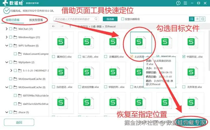 步骤3:在新的界面中,你可以等待深度扫描结束后再开始浏览和查找数据。在左栏选择你心仪的浏览方式,找到文件后,勾选它们并点击 【恢复】 。