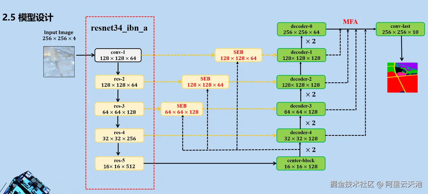在比赛中,我们选择Res_UNet作为baseline 模型,同时为了提高模型的泛化性能,我们选择了域泛化性能好的IBN-Net作为比赛backbone。具体网络结构如下: