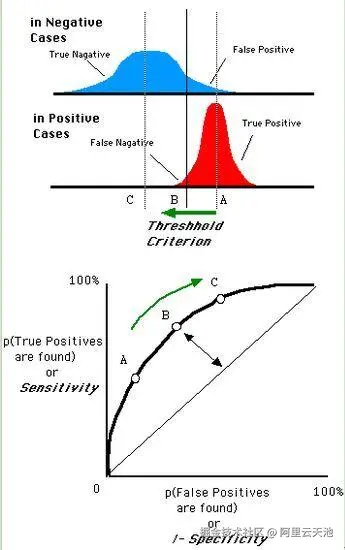 不难发现,这两个指标之间是相互制约的。如果某个医生对于有病的症状比较敏感,稍微的小症状都判断为有病,那么他的第一个指标应该会很高,但是第二个指标也就相应地变高。最极端的情况下,他把所有的样本都看做有病,那么第一个指标达到1,第二个指标也为1。