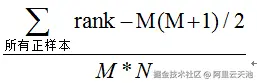 第三种方法:与第二种方法相似,直接计算正样本score大于负样本的概率。我们首先把所有样本按照score排序,依次用rank表示他们,如最大score的样本,rank=n(n=N+M),其次为n-1。那么对于正样本中rank最大的样本,rank_max,有M-1个其他正样本比他score小,那么就有(rank_max-1)-(M-1)个负样本比他score小。其次为(rank_second-1)-(M-2)。最后我们得到正样本大于负样本的概率为