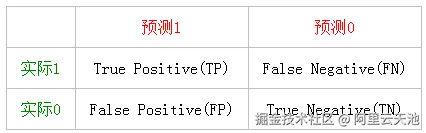 考虑一个二分问题,即将实例分成正类(positive)或负类(negative)。对一个二分问题来说,会出现四种情况。如果一个实例是正类并且也被 预测成正类,即为真正类(True positive),如果实例是负类被预测成正类,称之为假正类(False positive)。相应地,如果实例是负类被预测成负类,称之为真负类(True negative),正类被预测成负类则为假负类(false negative)。
