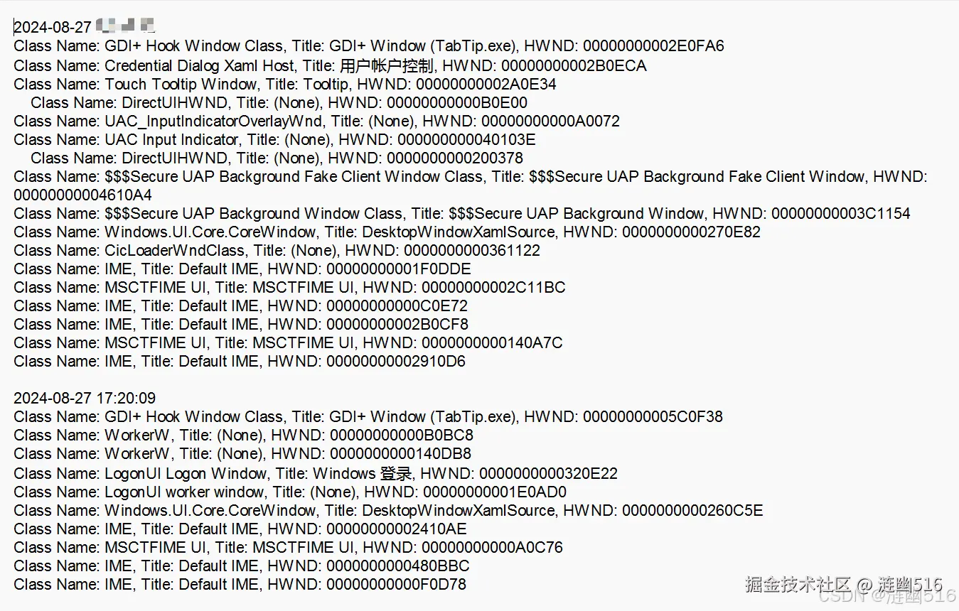 至于桌面的切换检测,最简单的就是通过一个循环不断去获取当前活动桌面(ActiveDesktop),主要通过 OpenInputDesktop 来获取,然后分析桌面名称,当桌面切换到 Winlogon 桌面时切换线程并遍历桌面窗口,当桌面切换到 Default 桌面时,停止记录并保存日志;