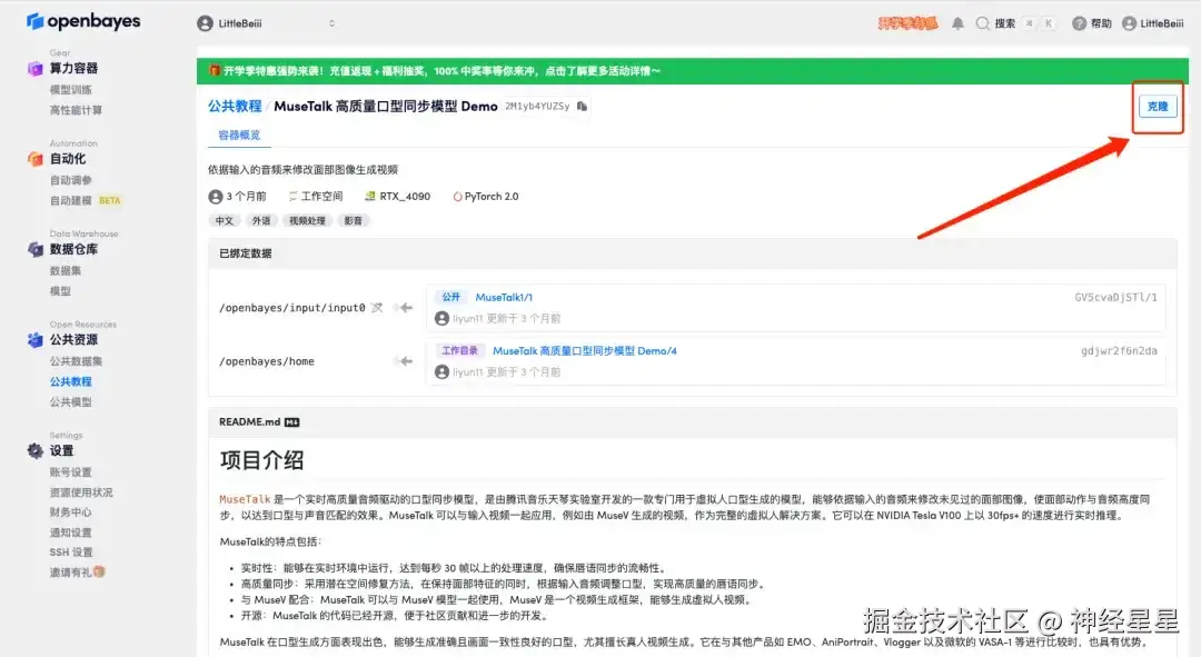 「MuseV 不限时长的虚拟人视频生成 Demo」和「MuseTalk 高质量口型同步模型 Demo」均已上线至 HyperAI 超神经官网的教程版块, 已经为大家搭建好了环境,无需输入任何命令,一键克隆即可立即启动!