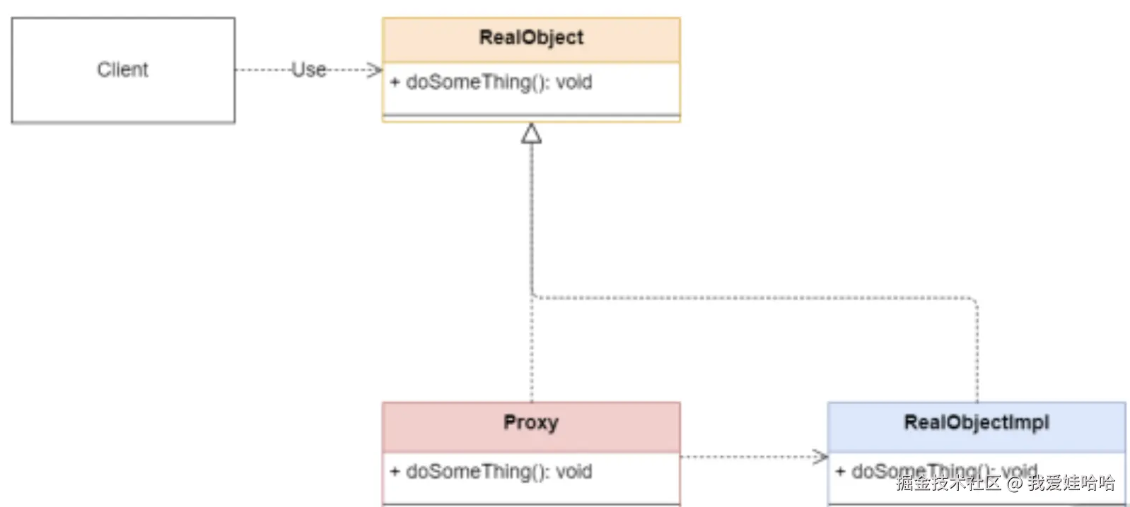 在上面的这段代码实现中,RealObjectImpl 实现了接口 RealObject 的功能 doSomething,这时我们又创建了一个代理对象 Proxy,它继承了 RealObjectImpl,目的是在使用 RealObject 时可以做一些额外的操作。