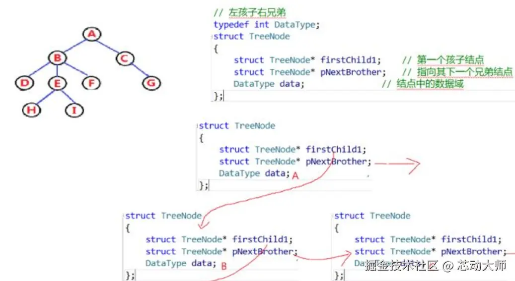 树结构相对线性表就比较复杂了,要存储表示起来就比较麻烦了,既然保存值域,也要保存结点和结点之间 的关系,实际中树有很多种表示方式如:双亲表示法,孩子表示法、孩子双亲表示法以及孩子兄弟表示法等。我们这里就简单的了解其中最常用的孩子兄弟表示法。