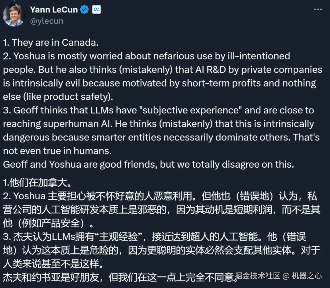 对于两位好友的看法,和他们一起获得 2018 年图灵奖的 Yann LeCun 表示完全不同意。他既不相信现在的大模型能达到超人水平,也不认为超级 AI 必然主宰人类。在他看来,现在对 AI 进行严格监管还为时过早。