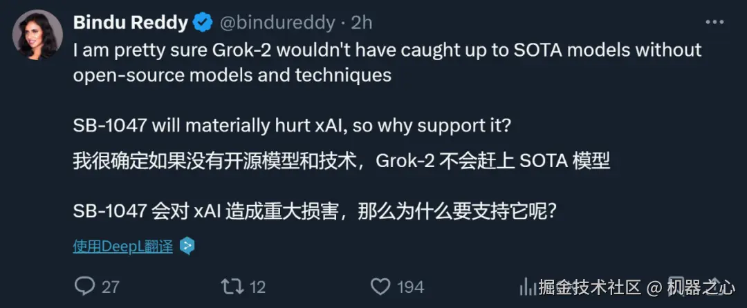 在反对声浪如此高涨的当下,马斯克的态度多少有点出人意料。毕竟一旦法案通过,他创建的 xAI 所训练的 Grok 系列模型也会被纳入监管范围,而且研发进度也可能受到影响。