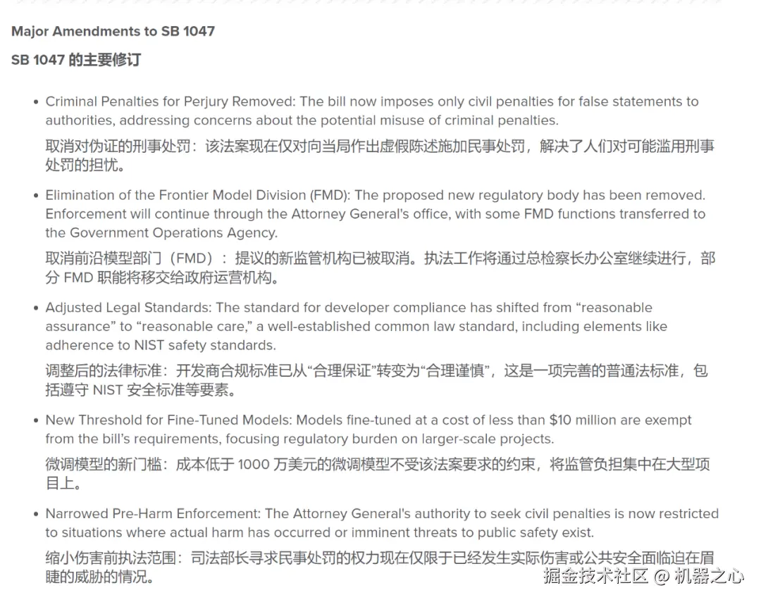 其实,在 OpenAI 发布公开信之前,SB 1047 已经经过了一番修改,以安抚科技公司,主要修订如下: