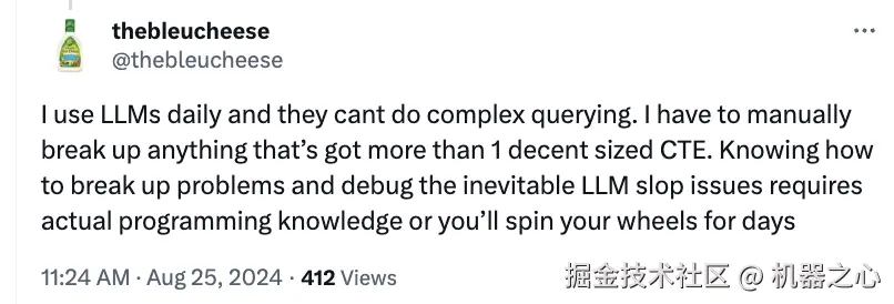 「我每天都用大模型,它们无法进行复杂的查询。任何超过一个 CTE 的内容,我都必须手动拆分。拆起来需要你会编程,否则只会白费几天的时间。」