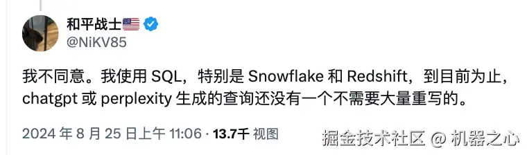 然而,也有在日常工作中经常用大模型生成 SQL 代码的网友得到了另一番体验:「到目前为止,ChatGPT 或 Perplexity 生成的 SQL 查询还没有一个不需要大量重写的。」