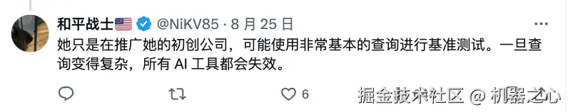 这位网友进一步质疑道:「当脱离了基准测试里的简单任务,需要做比较复杂的查询时,不会所有 AI 工具都失效了吧。」