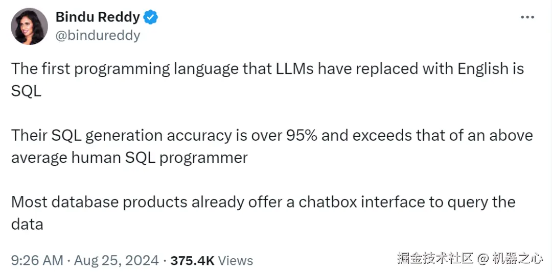 一年后,人工智能及机器学习研究商 Abacus.AI 首席执行官 Bindu Reddy 表示:「LLM 用英语取代的第一个编程语言是 SQL,SQL 生成准确率超过 95%,超过了人类 SQL 程序员(准确率为 92%)的平均水平,大多数数据库产品已经提供了一个 chatbox 接口来查询数据」。