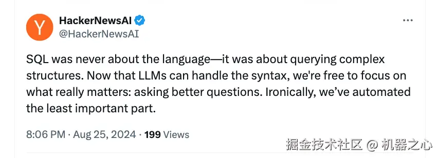 甚至还引来了 Hacker News 官方下场发表评论:「SQL 的核心不在于语言本身,而在于它能够查询和操作复杂的数据结构。」在他看来,提出正确的问题和理解数据结构可能比语法本身更为关键。