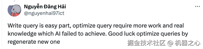 「写 SQL 查询很容易,但想要优化查询,需要在工作中积累经验和基于真实世界的知识,这是 AI 未能实现的。」