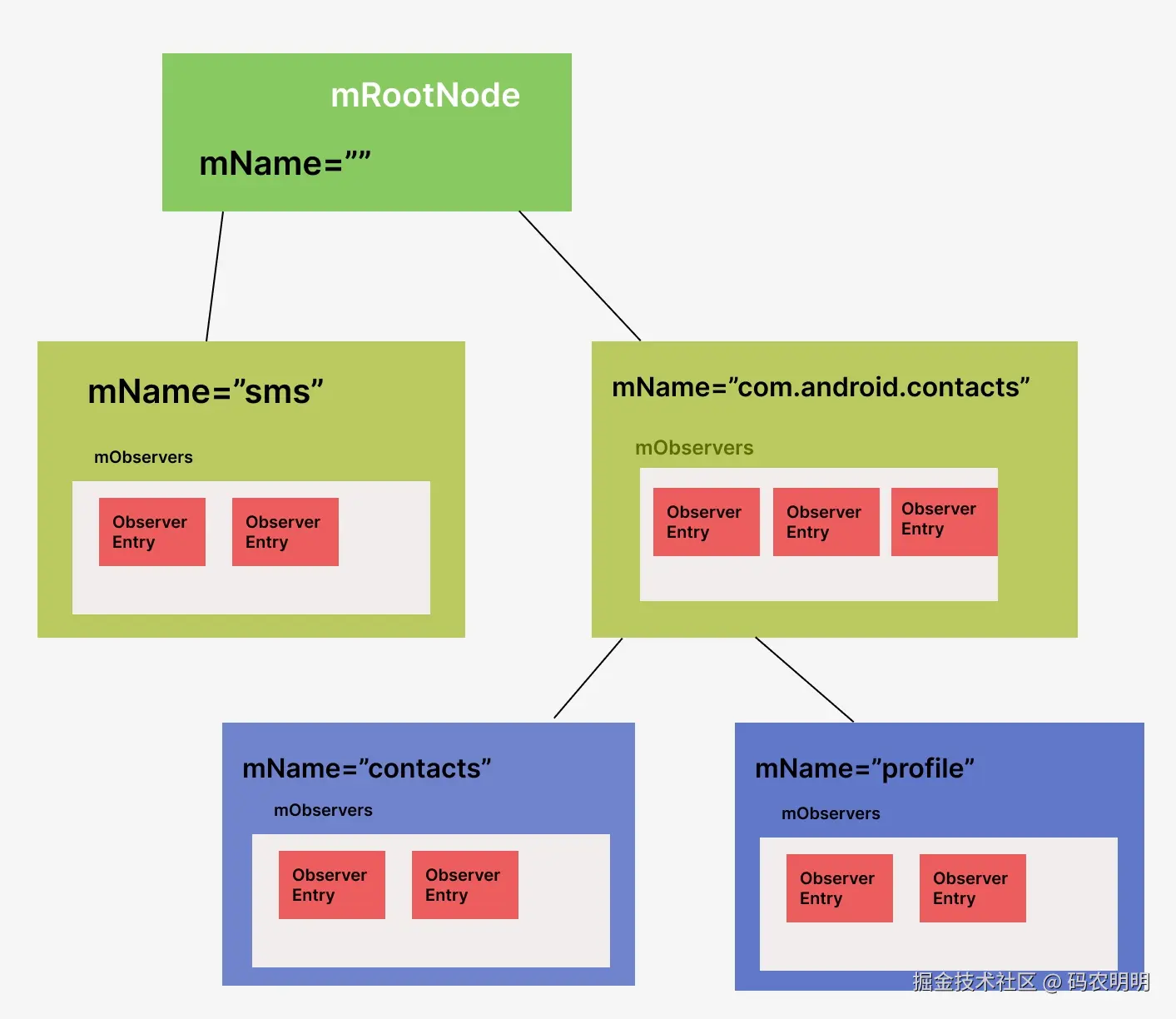 传入的segmentCount为Uri的path的数量加上authority的数量,比如content://sms/inbox这个uri它的segmentCount就是2,而从外面传如的index为0。它会先调用collectMyObserversLocked方法来遍历当前Node层级的ObserverEntry,代码如下: